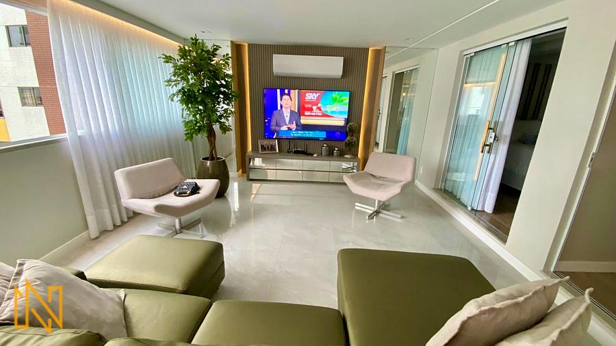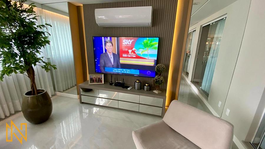O living é composto por três espaços generosos, proporcionando um ambiente espaçoso e agradável.