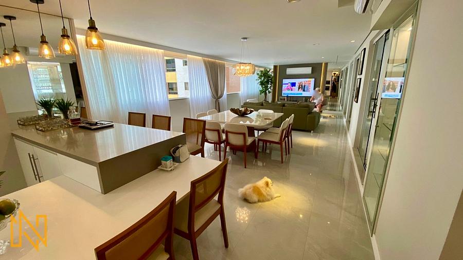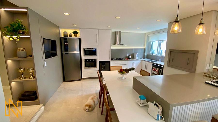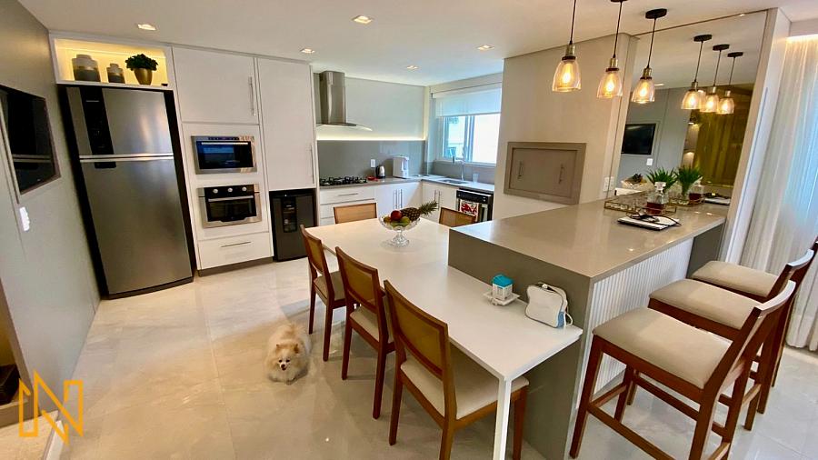 A cozinha é completa e conta com um moderno espaço gourmet, equipado com churrasqueira a carvão e lava-louças, tornando-o ideal para entretenimento e momentos especiais. Além disso, há uma elegante sala de jantar para refeições em grande estilo e uma confortável sala de estar, perfeita para relaxar e assistir televisão.
