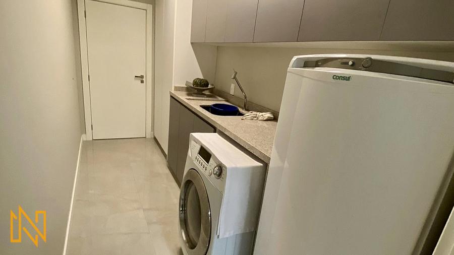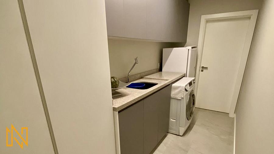 A lavanderia é ampla e bem equipada, tornando as tarefas domésticas mais práticas. Há também um corredor com armários adicionais, oferecendo espaço de armazenamento extra e organização.