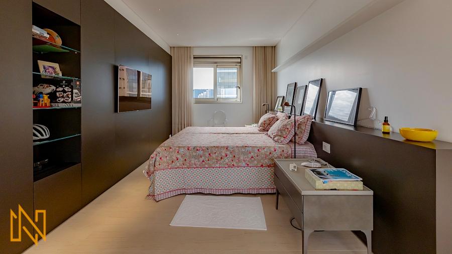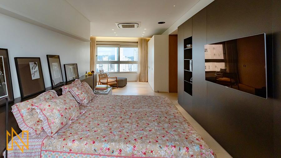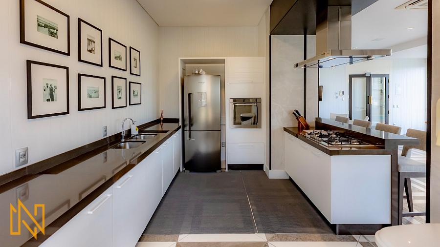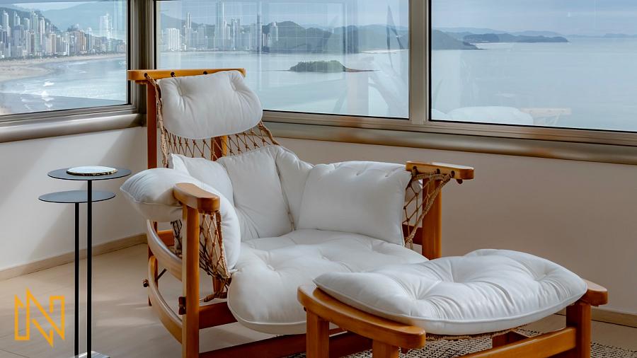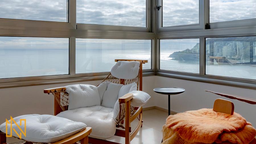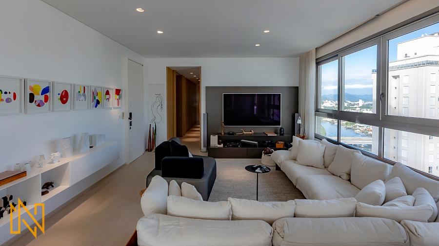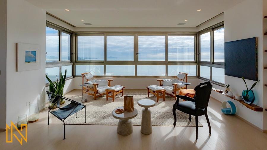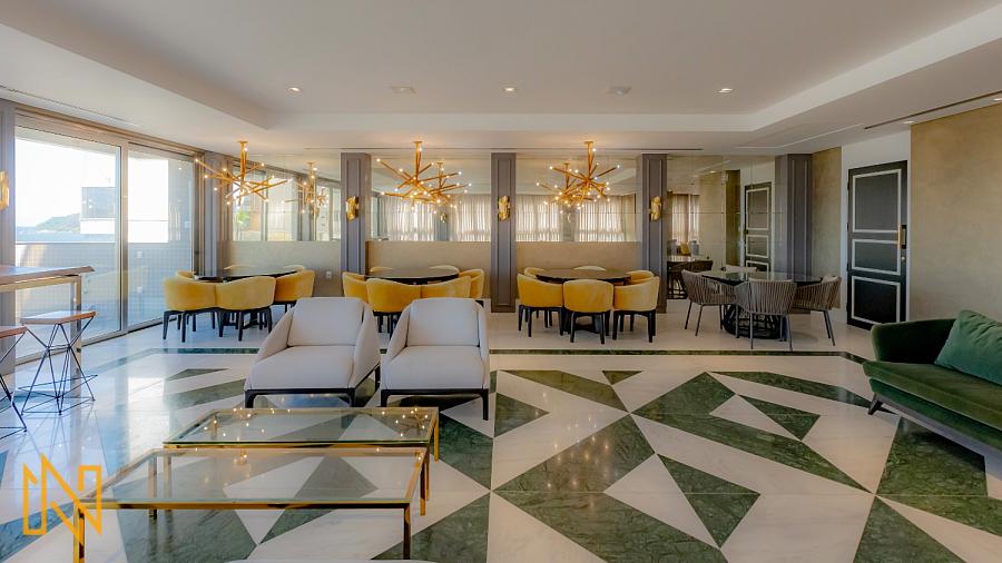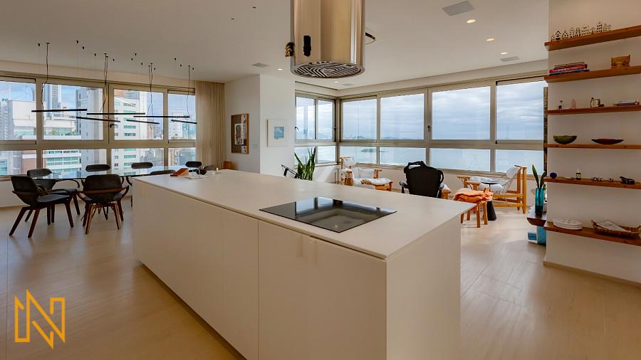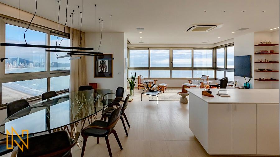 Tudo aqui respira sofisticação e funcionalidade. Quatro suítes amplas – incluindo a master com banheira de imersão e closet generoso –, lavabo social, living integrado que une sala de estar, sala de jantar e sala de TV em um ambiente fluido com vista total para a praia, cozinha gourmet equipada com churrasqueira a carvão e bancada ampla, área de serviço com dependência de empregada e banheiro próprio, além de cinco vagas de garagem privativas. Totalmente decorado e mobiliado, pronto para morar ou investir com imediata valorização.