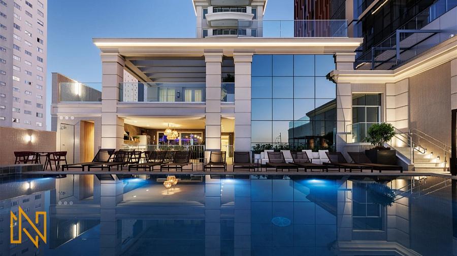 Área de Lazer com 2.200 m²: Distribuída em 3 pavimentos, com 3 piscinas (coberta aquecida, externa com prainha e espelho d’água com fonte).