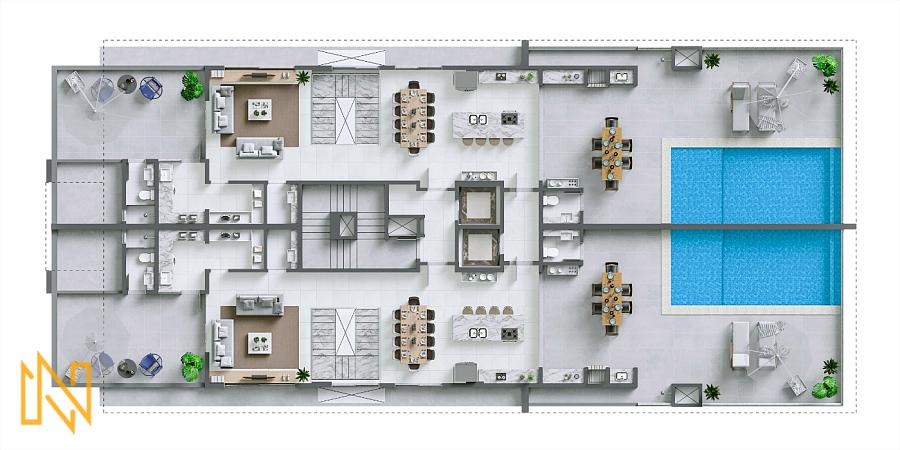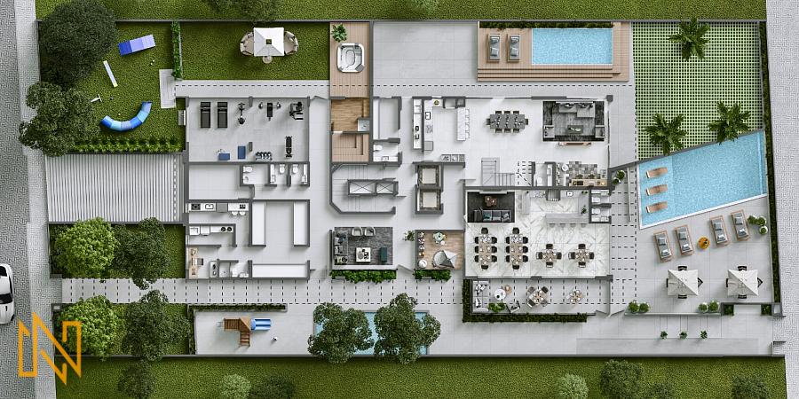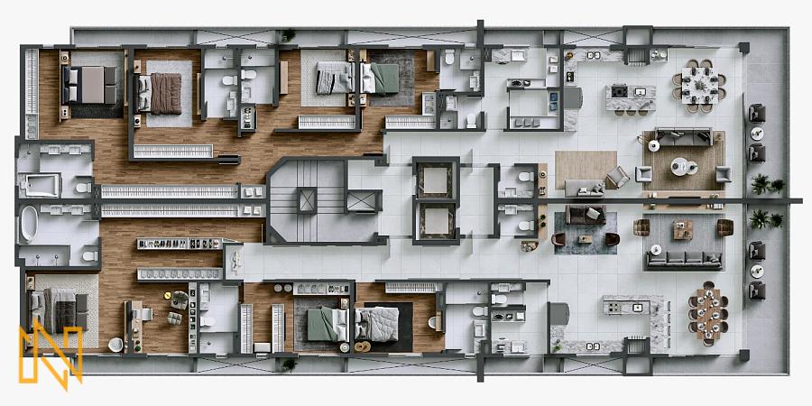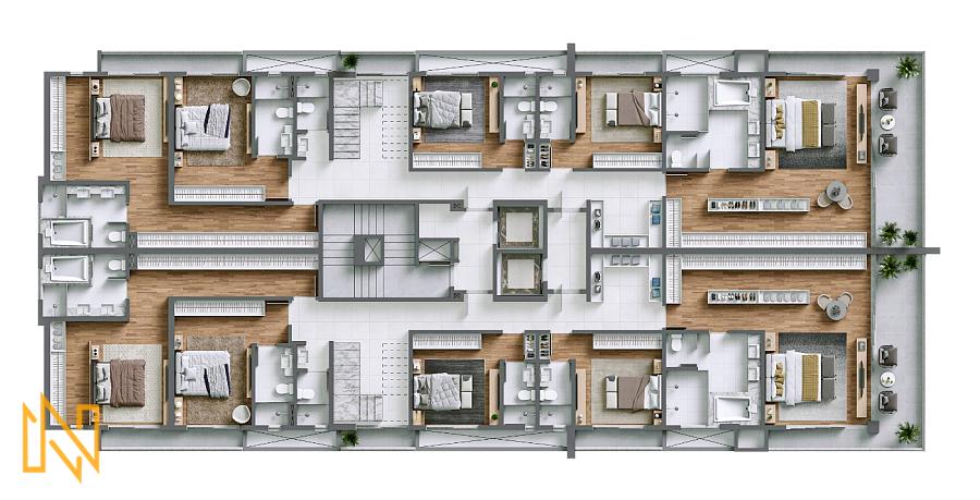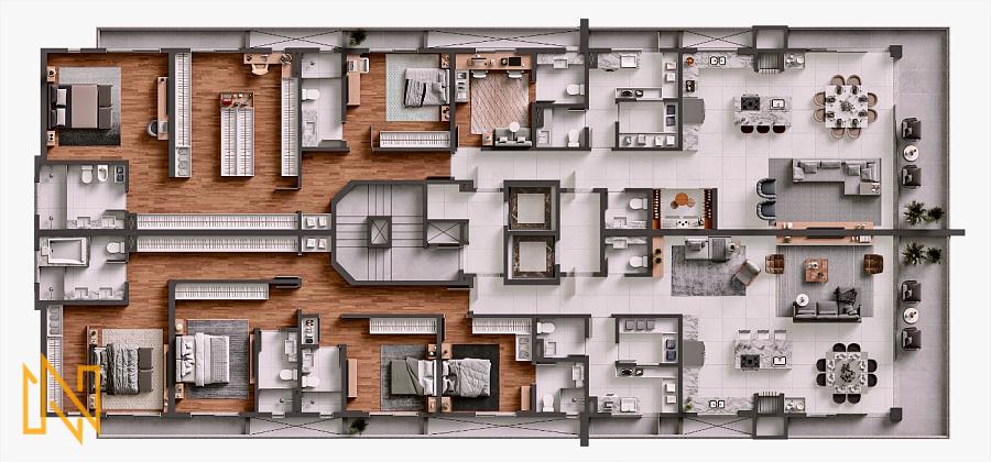- Tecnologia construtiva com lajes protendidas que possibilitam customização da planta,