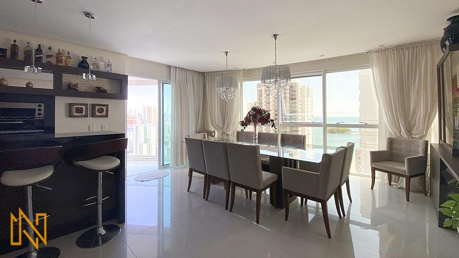 Entre e perceba o fluxo inteligente: living amplo que une sala de estar, jantar e espaço gourmet, tudo integrado à cozinha planejada com armários que facilitam o dia a dia. A sacada vira extensão natural do social – perfeita para o café da manhã com vista mar ou para relaxar ao entardecer enquanto o sol se põe no horizonte. Três suítes completas, cada uma com banheiro espaçoso e armários embutidos: privacidade total para a família, sem abrir mão de arejamento e iluminação natural. Lavabo discreto para visitas, área de serviço funcional com entrada própria, piso porcelanato nas áreas sociais e laminado nas íntimas, acabamento em gesso impecável. 151 m² privativos (281 m² totais), 4 banheiros distribuídos com inteligência, ar-condicionado, aquecimento de água e móveis planejados – um lar que acolhe sem precisar de ajustes.