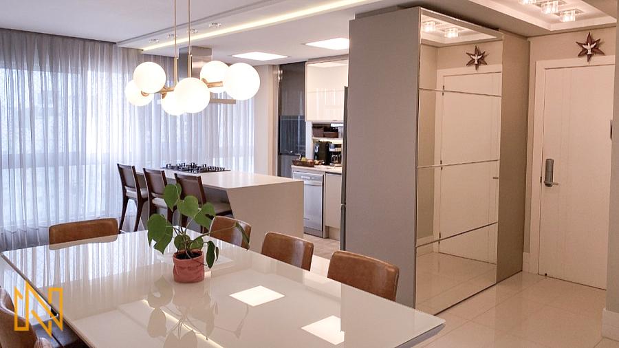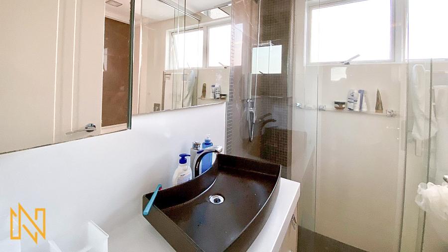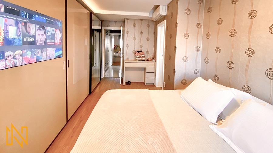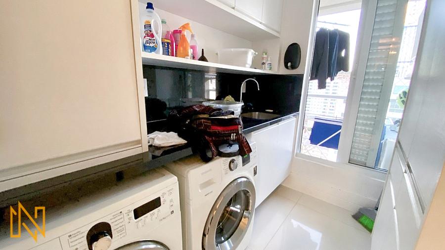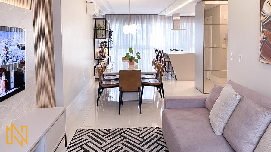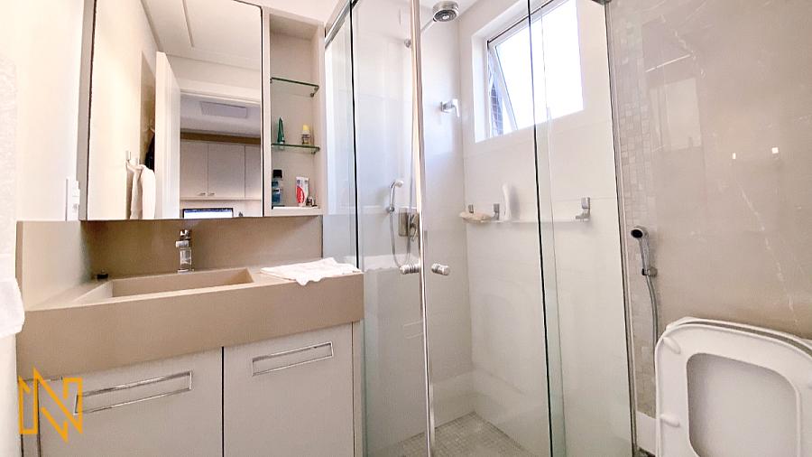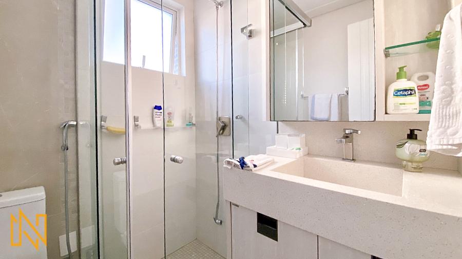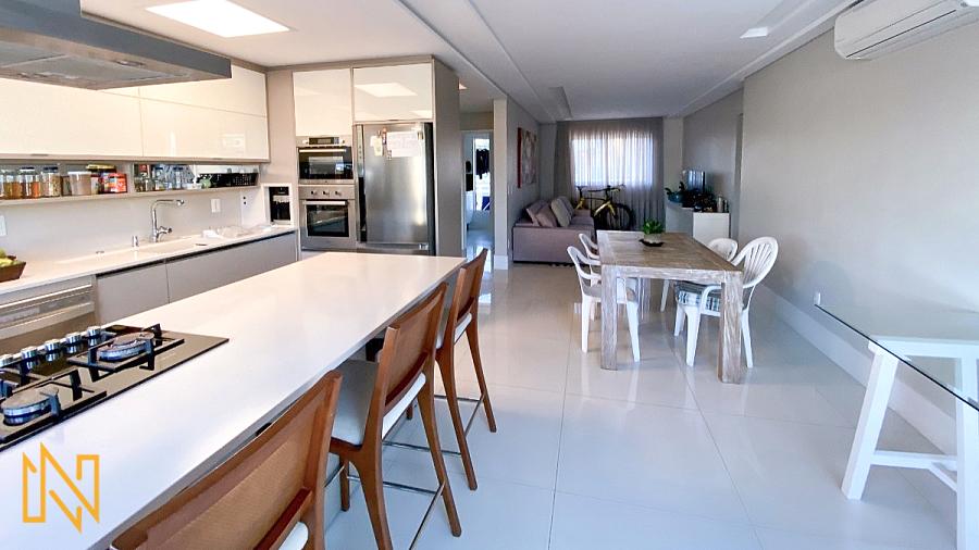 Imóvel mobiliado, conta com 122m² de área privativa, 3 suítes, lavabo, área de serviço, cozinha americana, sala de estar, sala de jantar, living integrado com pequena vista do mar e 2 vagas de garagem privativas.