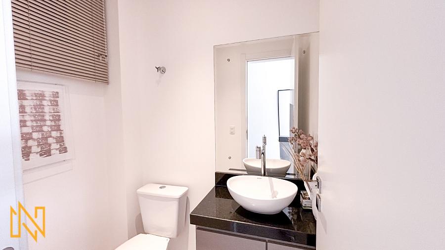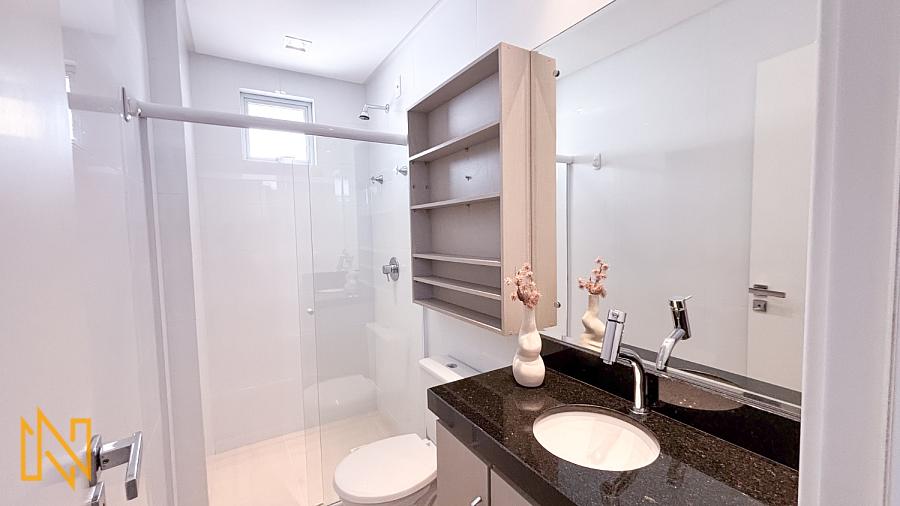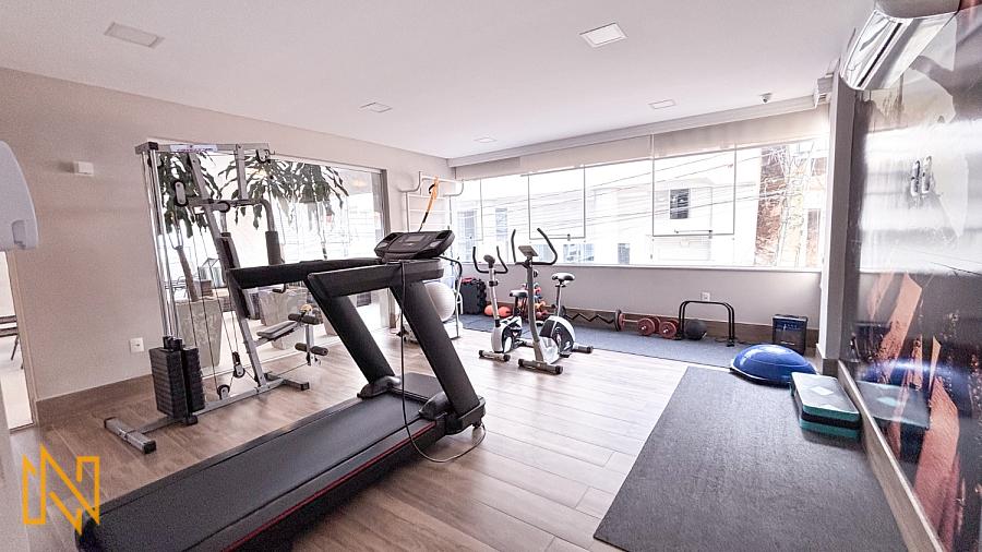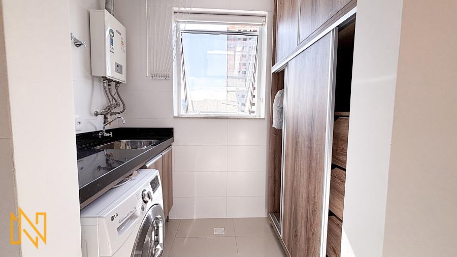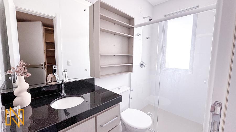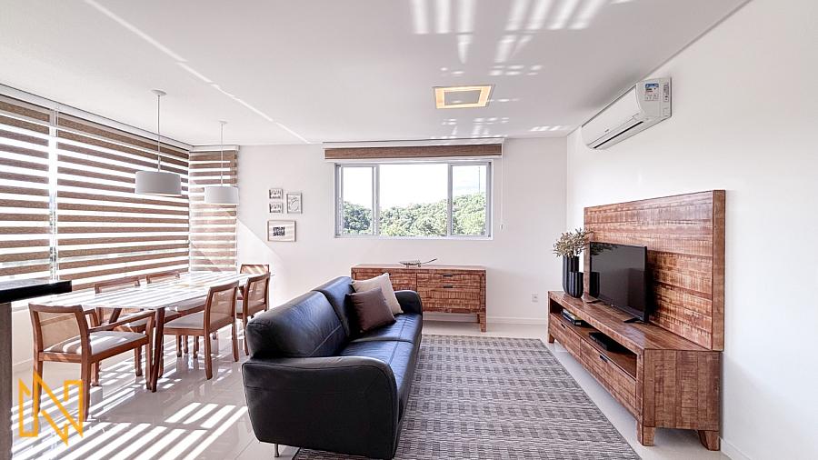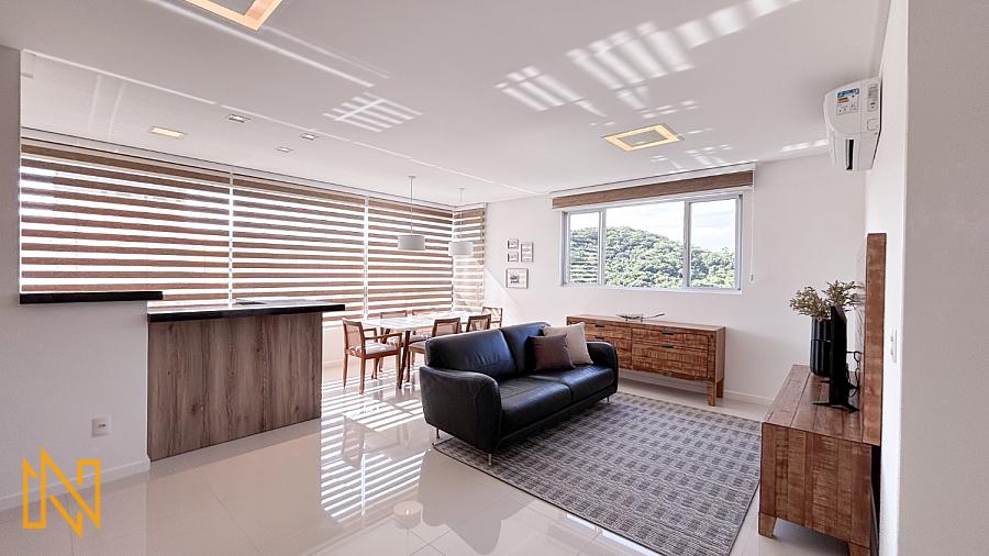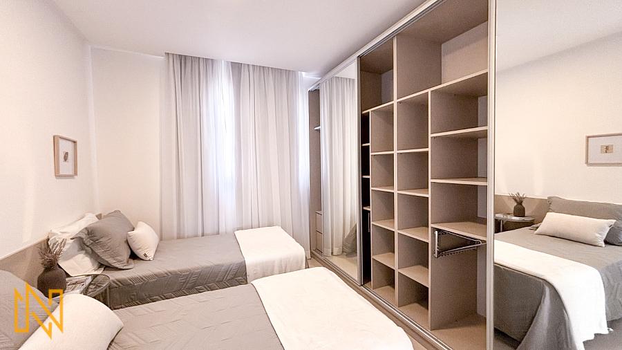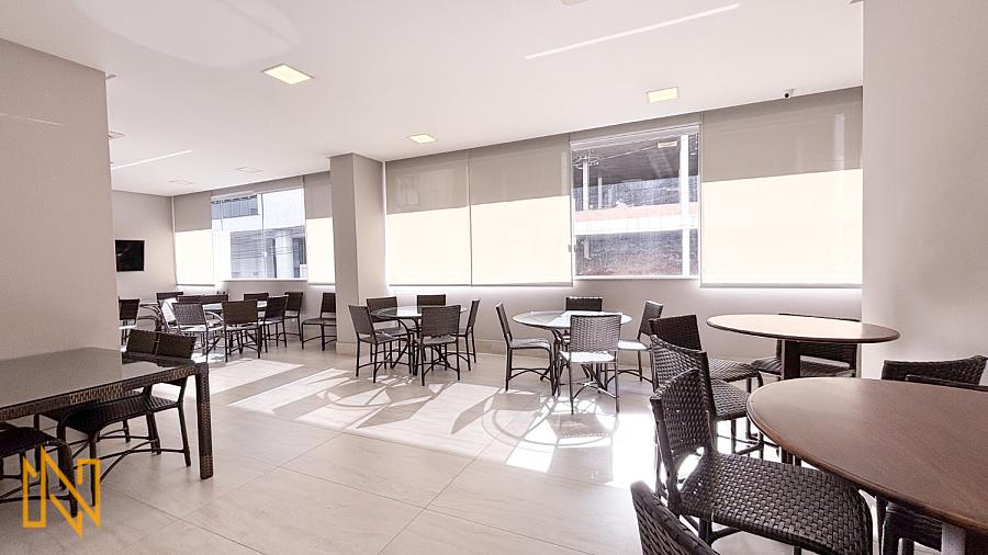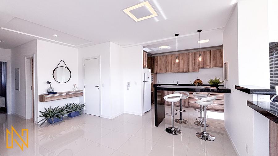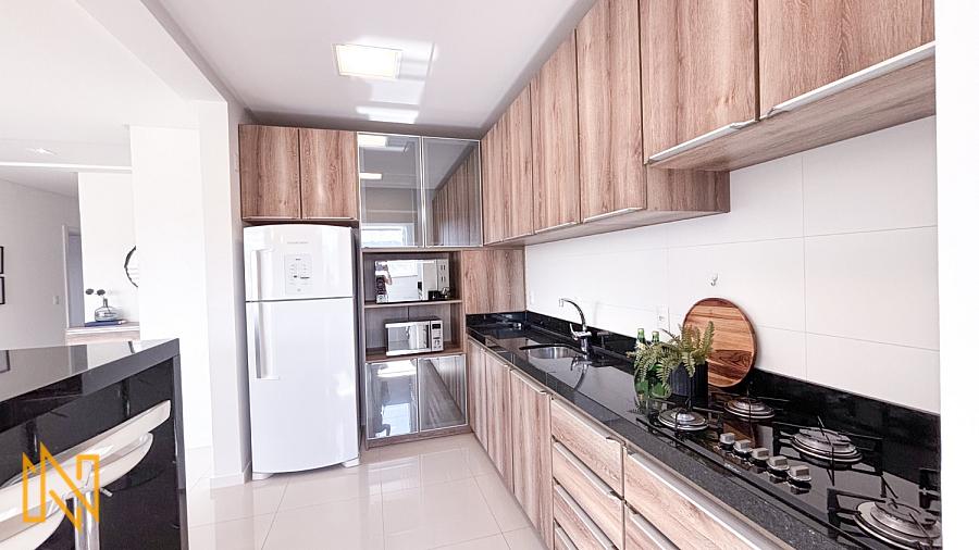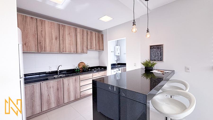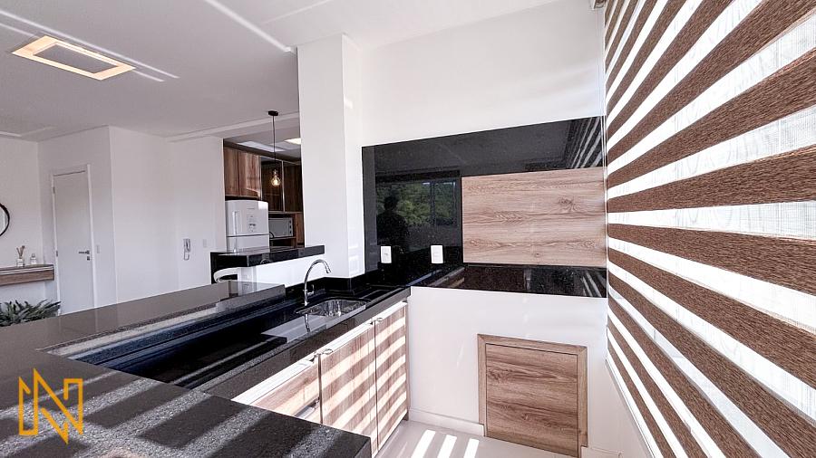 Apartamento com o living integrado sendo 98m², 2 suítes, lavabo, churrasqueira a carvão, área de serviços independente e 2 vagas de garagem privativas.