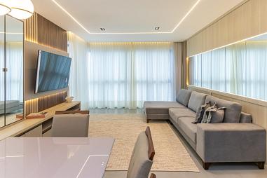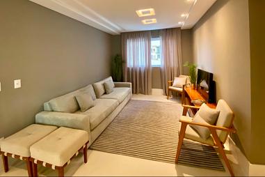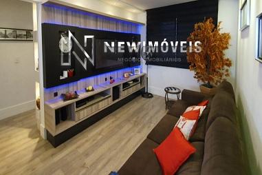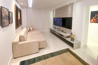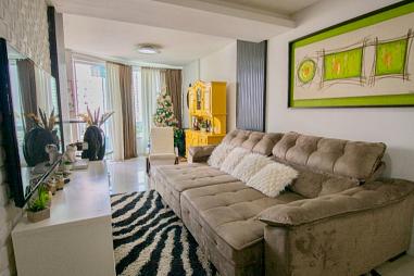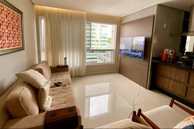 Apartamento todo mobiliado, conta com 125m² de área privativa, possui um amplo living com sala de estar, jantar e sacada gourmet com churrasqueira a carvão integradas com uma vista linda do pontal norte e roda gigante, possui lavabo, 3 dormitórios sendo uma suíte e 2 vagas de garagem privativas.