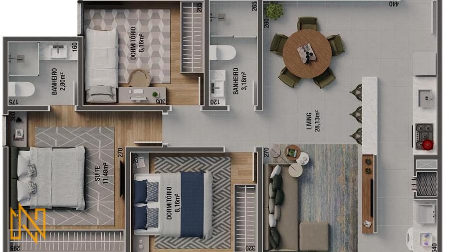 Acabamentos premium: Piso porcelanato nas áreas sociais, piso laminado nas áreas íntimas, infraestrutura para ar-condicionado e medidores individuais.
