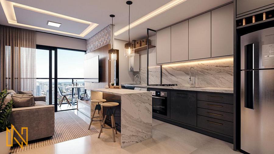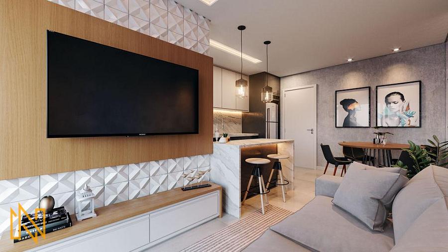 Ambientes integrados: Amplo living com sala de estar e jantar, cozinha americana e área de serviço.