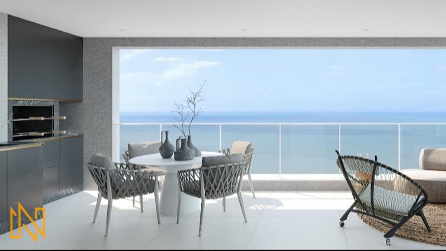 Sacada com vista mar: Equipada com churrasqueira a carvão, ideal para momentos de lazer com vista panorâmica.