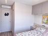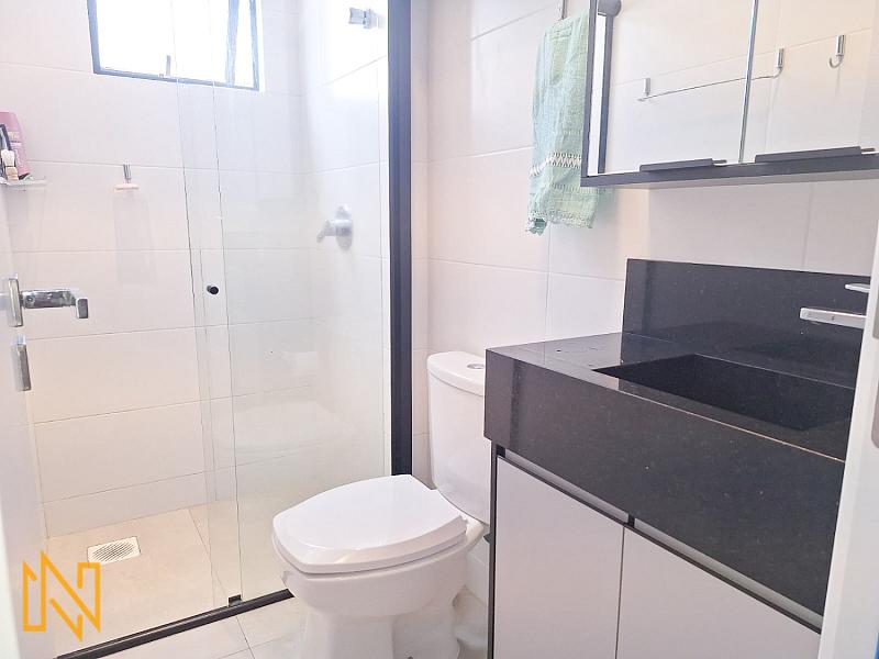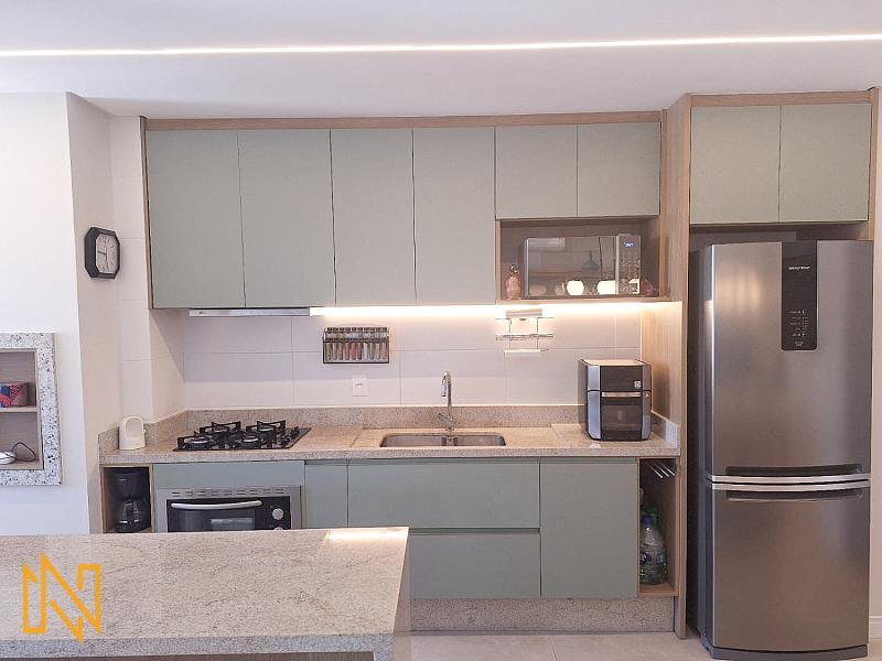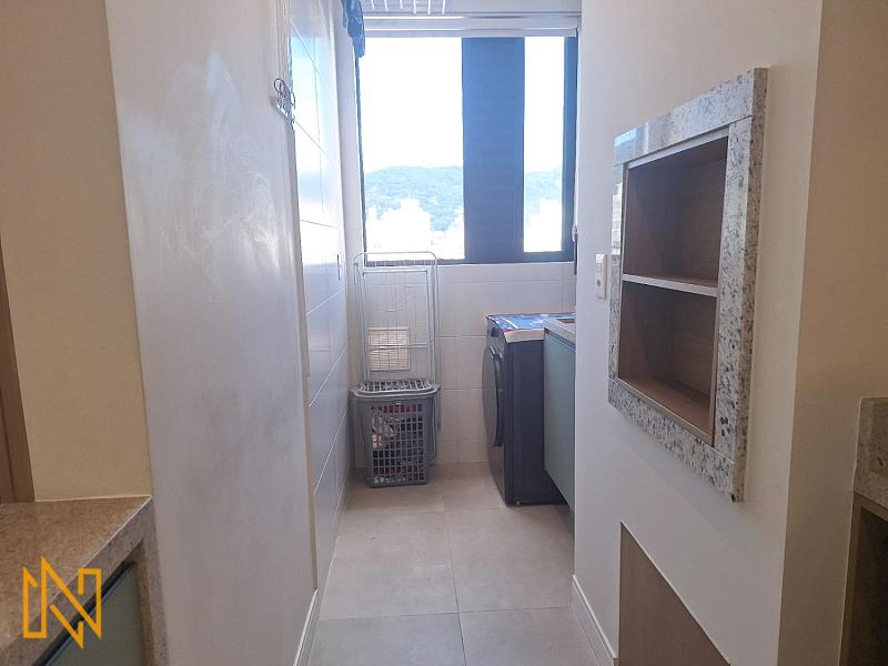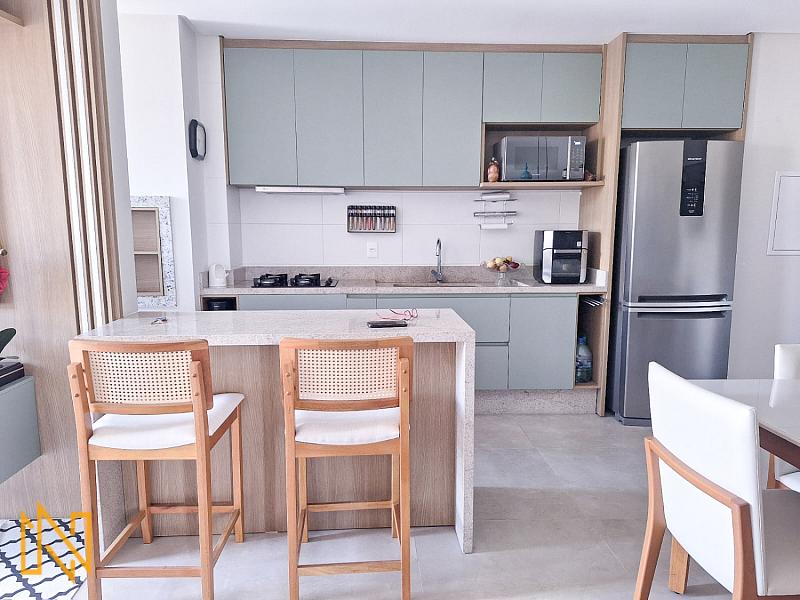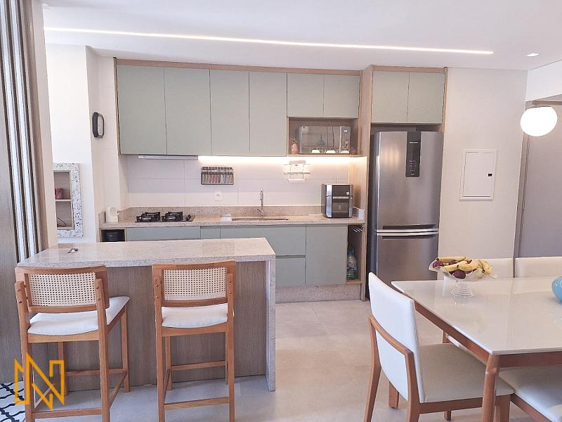 A cozinha é funcional, equipada com armários planejados e espaço para refeições rápidas. O apartamento também conta com uma área de serviço prática, facilitando o dia a dia.