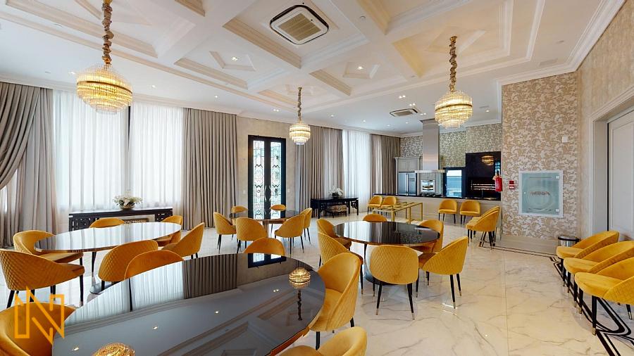 Quanto aos espaços comuns são eles: Piscina adulto com borda infinita, 02 hidromassagens, piscina infantil, piscina térmica, solarium, spa com hidro e descanso, sauna úmida, sala de massagem, sauna seca com tijolos de sal rosa, academia, brinquedoteca, garden, playground, jogos teen, salão de festas, salão gourmet, sala de jogos e bar, outdoor grill, lounge.