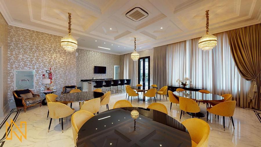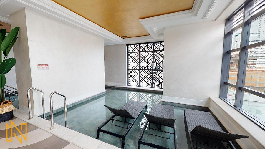Quanto aos espaços comuns são eles: Piscina adulto com borda infinita, 02 hidromassagens, piscina infantil, piscina térmica, solarium, spa com hidro e descanso, sauna úmida, sala de massagem, sauna seca com tijolos de sal rosa, academia, brinquedoteca, garden, playground, jogos teen, salão de festas, salão gourmet, sala de jogos e bar, outdoor grill, lounge.