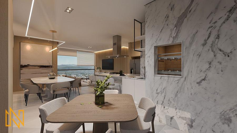 Living integrado à cozinha com churrasqueira a carvão, ideal para momentos de lazer
