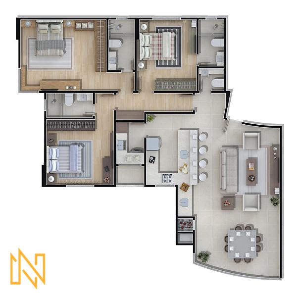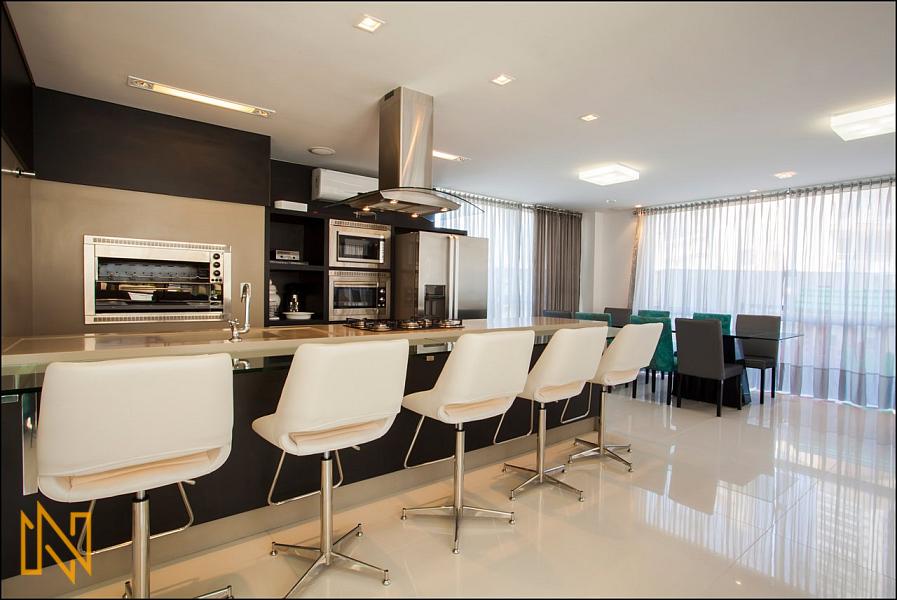 Imóvel com 132,20m² de área privativa composto por 3 suítes, sala para 2 ambientes, banheiro social, sacada integrada churrasqueira, cozinha, box praia, Portas Laqueadas, Infraestrutura para climatização, sonorização e internet, Rebaixamento de gesso em todo apartamento, janelas com persianas automatizadas (controle remoto) e 3 vagas de garagem individuais.