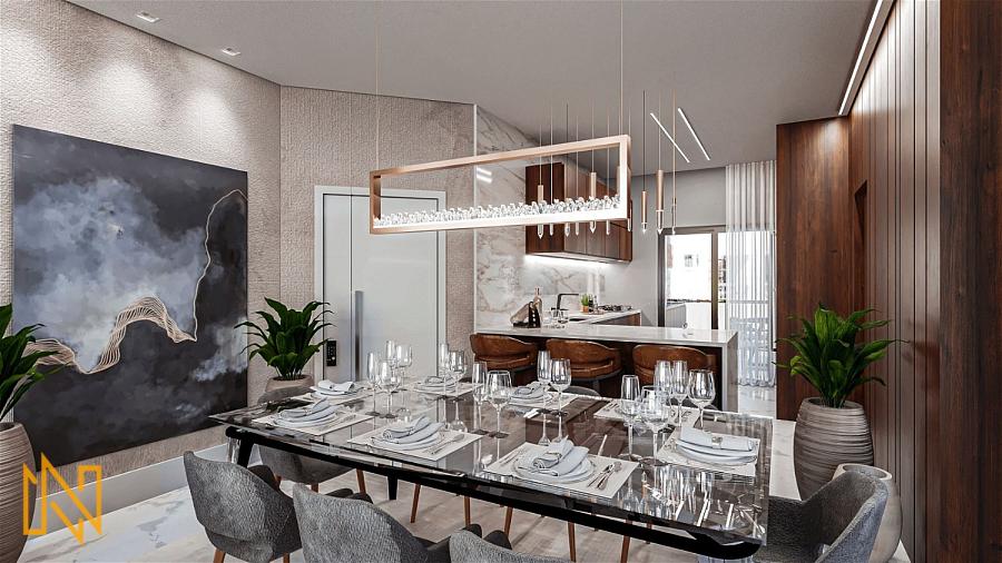 Apartamento com 3 Suítes, Sala, Cozinha, Living, Lavabo, Área de serviço, Churrasqueira à carvão na sacada, Infraestrutura para persianas automatizadas nas suítes, Aquecimento de água à gás, Opção de piso vinílico nas suítes, Acabamento em gesso, Tubulação para ar condicionado tipo split, Fechadura com senha na porta de entrada, Acabamento em gesso e 2 vagas de garagem privativa.