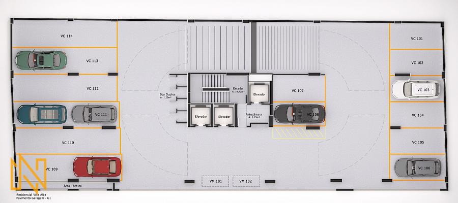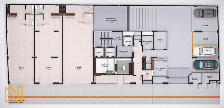O Edifício contará com 03 Elevadores sendo 02 Sociais para 08 pessoas e 01 de serviço para 10 pessoas e 02 Pavimentos de Lazer