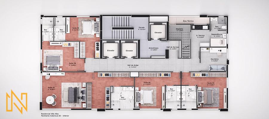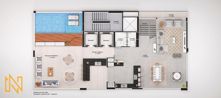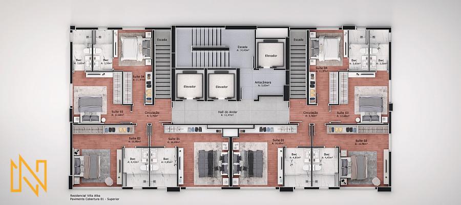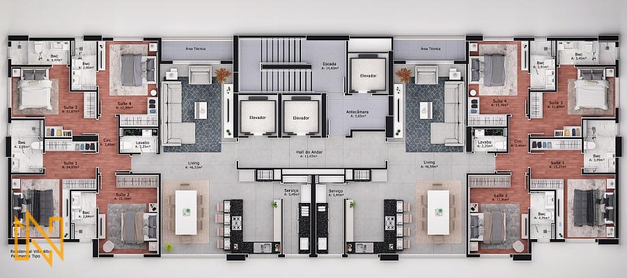 Serão 24 apartamentos tipo, com 142,65m² de área privativa, 04 suítes, lavabo, área de serviço, cozinha integrada, amplo living acomodando sala de estar e jantar, churrasqueira a carvão, piso em vinílico nos dormitórios e porcelanato na área comum. Os apartamentos terão medidor de água (hidrômetro) e de gás individuais, tubulação de ar-condicionado split, tubulação para água quente, portas laqueadasf Fechaduras eletrônicas, divisórias em Dry Wall e 3 vagas de garagem.