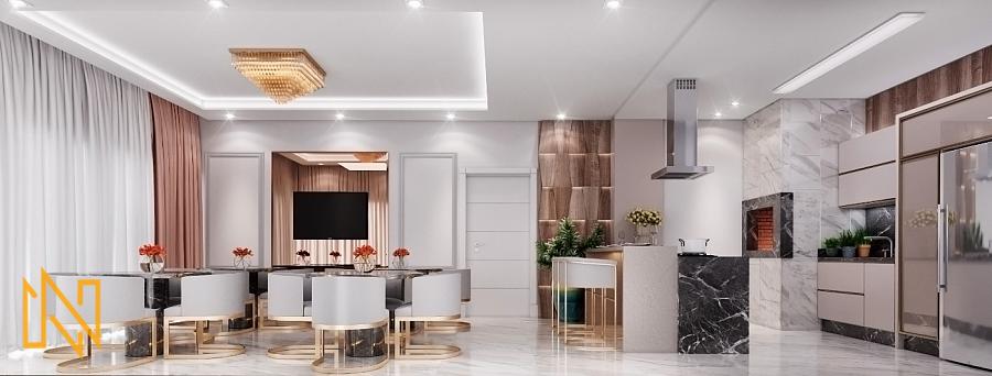 Salão de Festas com pé Direito Duplo para 50 pessoas com churrasqueira a carvão