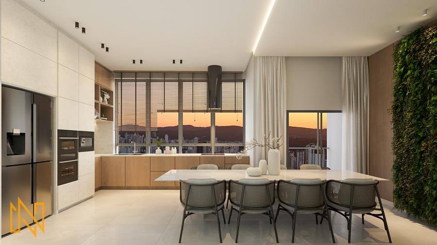 Cozinha semi-integrada, perfeita para interação e funcionalidade;
