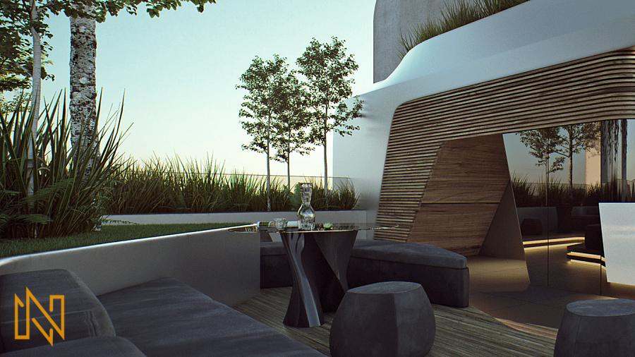 Espaços de relaxamento, incluindo lounge externo e áreas de convivência.