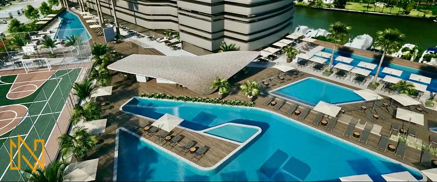 Lazer 1, localizado no 7º pavimento e voltado ao entretenimento: com 5 piscinas abertas aquecidas dividas por piscina família, jovem, infantil e baby, mais uma adulta com borda infinita, a piscina adulto conta com spa; Quadra poliesportiva de tamanho original, 502m²; Bar panorâmico, com vista para a mata, marina e cidade; Praça de fogo; Bar de apoio ao espaço família; Playground; Quadra poliesportiva infantil.