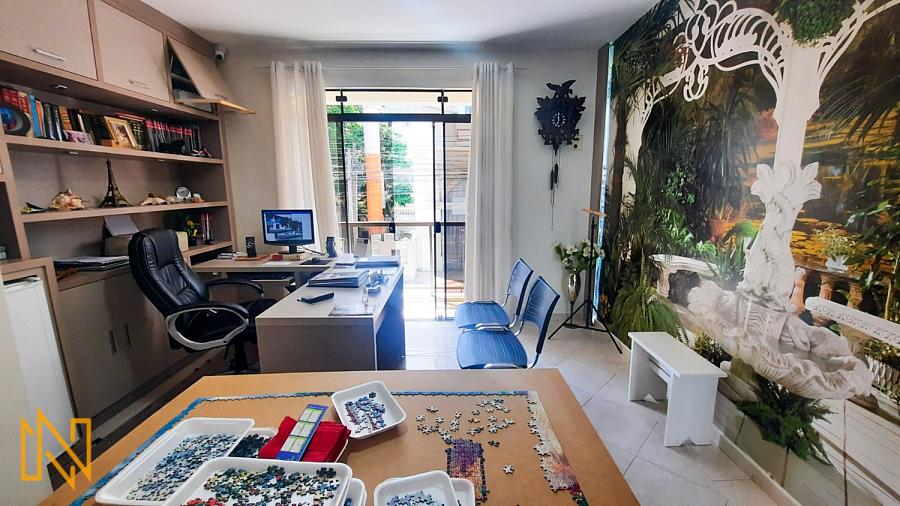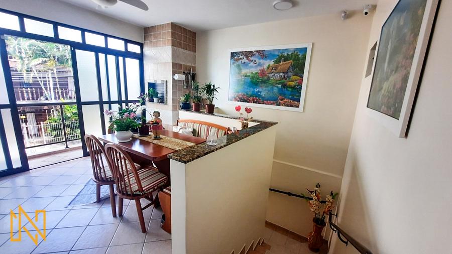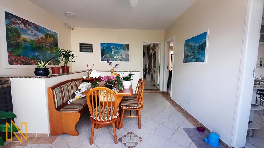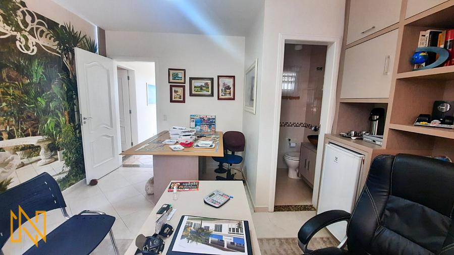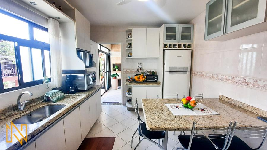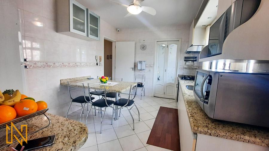 Cozinha, área de serviço, ampla sacada com boa posição solar, churrasqueira a carvão, escritório com banheiro, sala de estar e jantar.