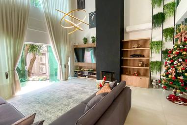 A casa conta com amplo living com cozinha integrada, lavabo e área de serviço, com ventilação cruzada. Quintal externo com churrasqueira. Escada em concreto cru, pode ser personalizado conforme o gosto do proprietário, e corrimão em aço inox. Clarabóia que permite iluminação natural, uma suíte com sacada, e mais duas demi suítes com terraço interligando-as. Ainda, garagem coberta para dois carros, portão eletrônico. Espera para água quente/fria e pontos para ar condicionado split.