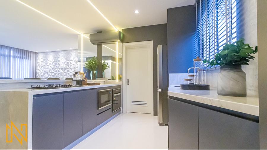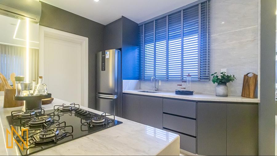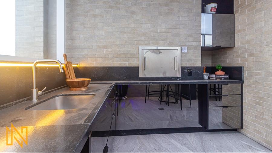 Cozinha planejada com churrasqueira, perfeita para refeições gourmet e momentos sociais;