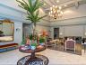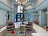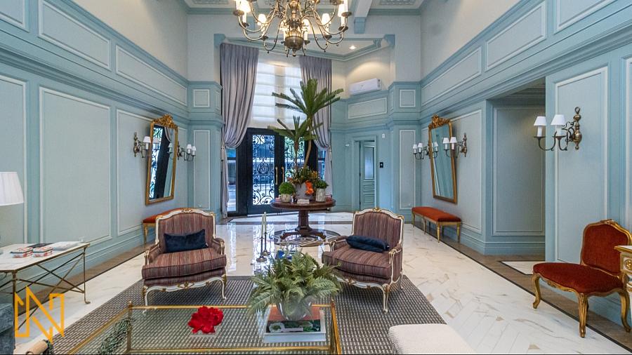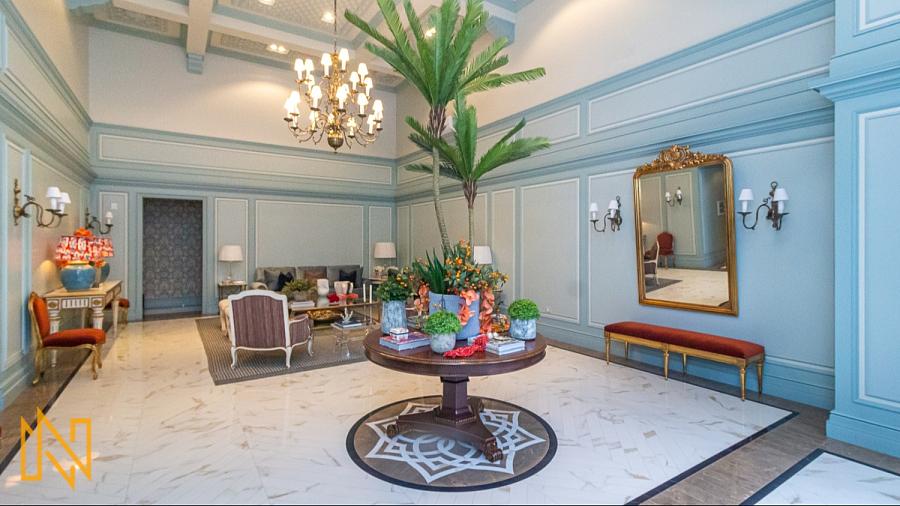 Hall social com pé-direito duplo, finamente decorado para uma recepção imponente;