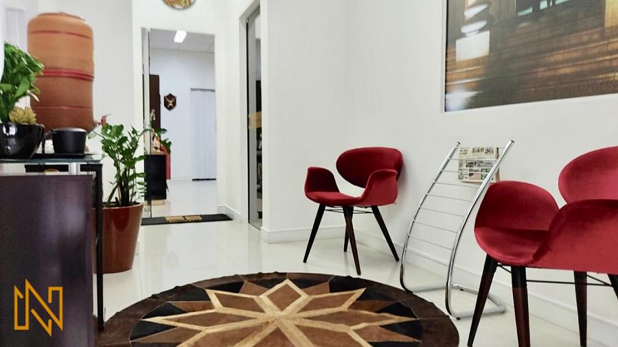 Destacando-se por sua frente ampla, esta sala oferece em seu total 120m², permitindo a criação de dois escritórios independentes, um em cada andar. Cada um desses escritórios seria completo, contando com seu próprio banheiro, copa e entrada individual, proporcionando flexibilidade para aluguel futuro ou utilização independente.